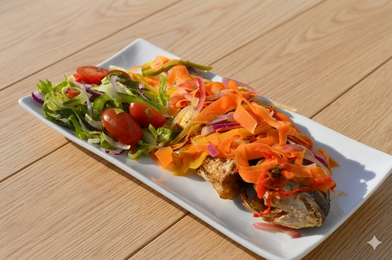 Escovitch Fish Meal with Rice & Peas, Plantain and Salad