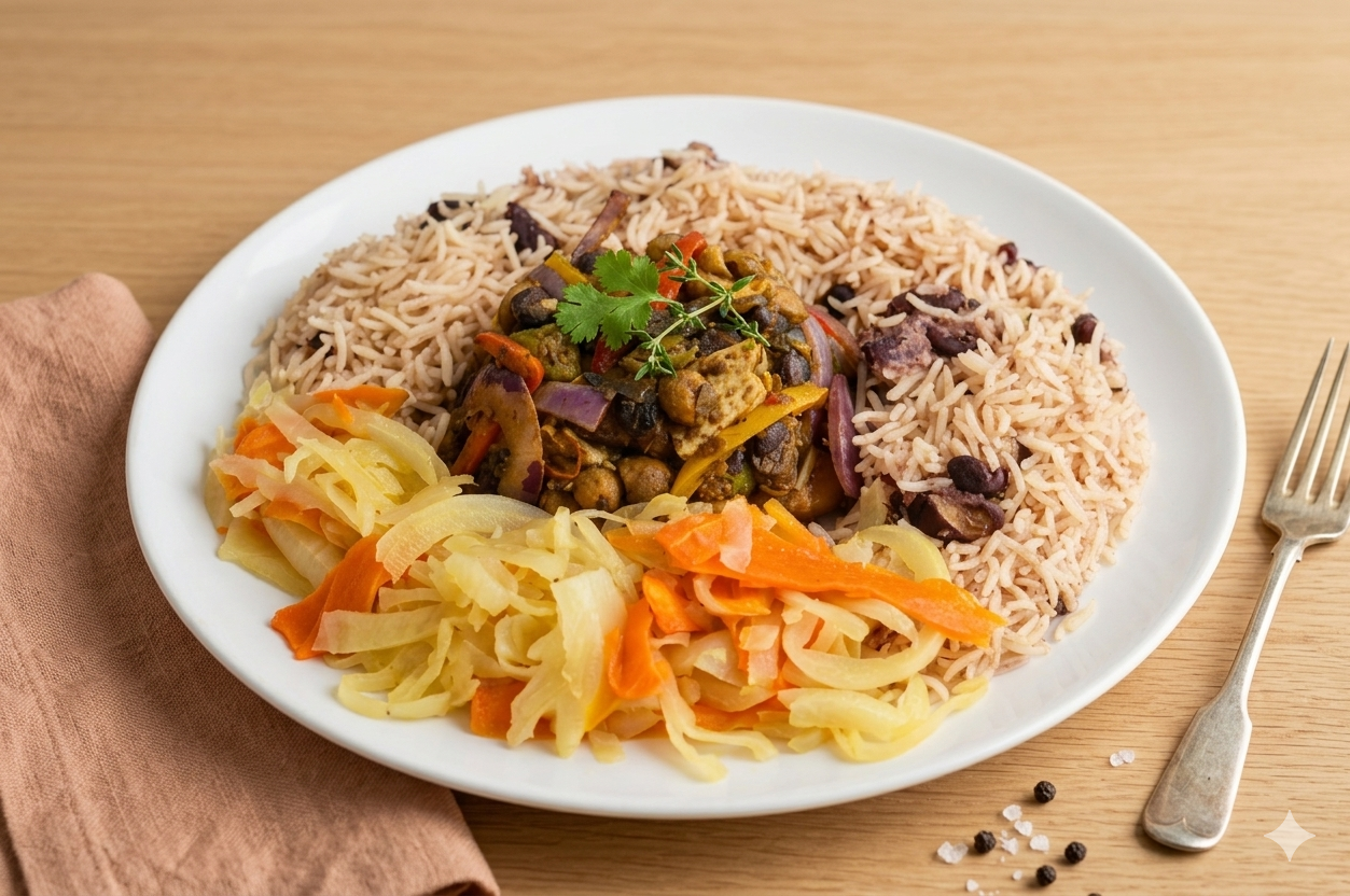Marinated tofu stir-fried with a colourful mix of seasonal vegetables, chickpeas, and Caribbean spices, served with rice and peas and a side of tangy pickled vegetables. A vibrant, flavour-packed plant-based dish.