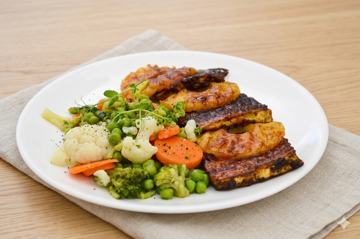 Grilled jerk-marinated tofu served with roasted plantain and a medley of fresh steamed vegetables. Smoky, spicy, and perfectly balanced with natural sweetness and bold Caribbean flavour.
